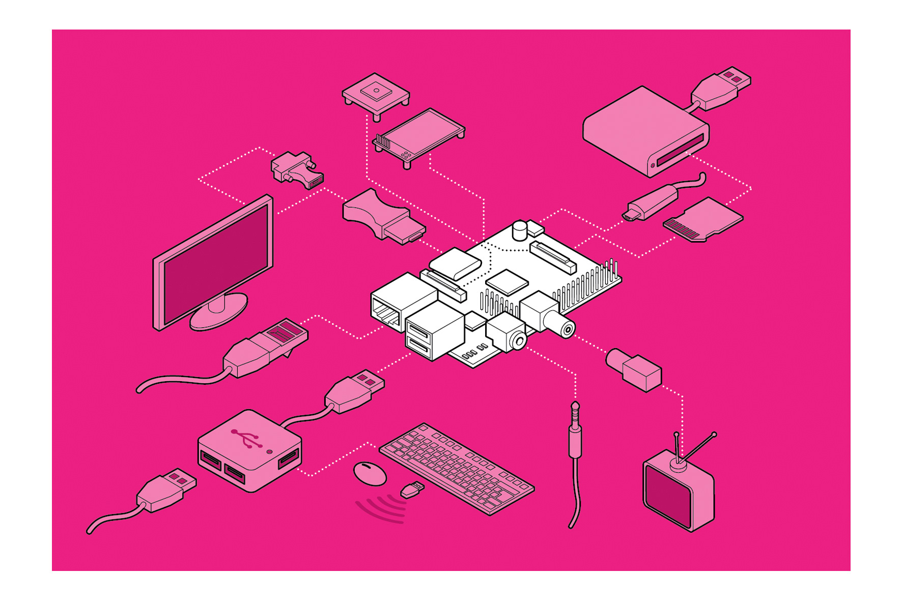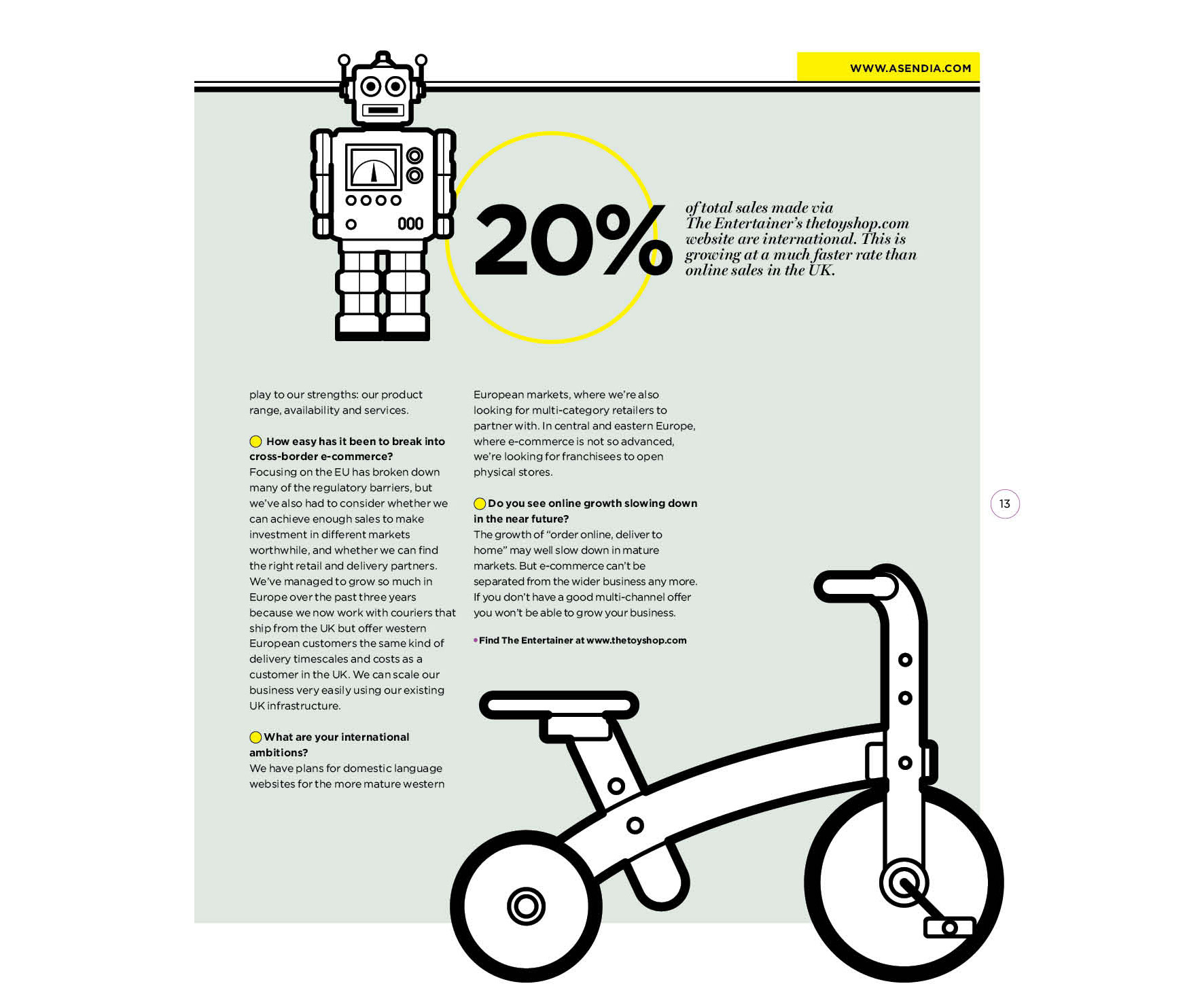 Line art illustration for Asendia Magazine. Bold crisp and clean, robots and product components.